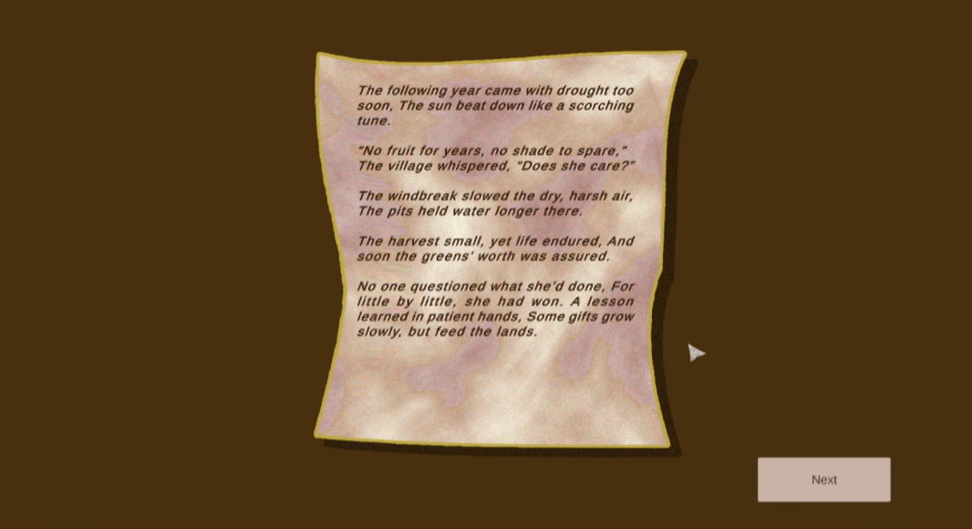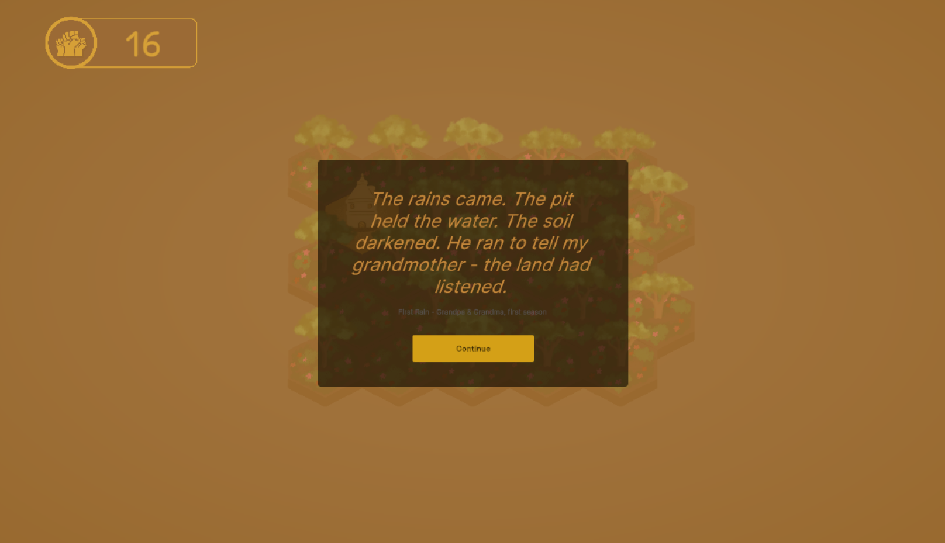 You play as the collective effort of a village digging Zaï pits, traditional half-moon earthworks from the Sahel, to capture seasonal rainfall and redirect it to degraded soil patches. Taking the knowledge passed down from community's past, using the experience gathered from years of hard work, you hear stories of how your family approached these natural challenges